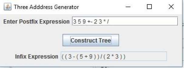Pressing the Construct Tree button should cause the tree to be constructed and using that tree, the corresponding infix expression should be displayed and the three address instruction file should be generated.