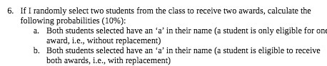 6. If I randomly select two students from the class to receive two awards, calculate the following probabilities (10%): a. Both students selected have an ‘a’ in their name (a student is only eligible for one award, i.e., without replacement) b. Both students selected have an ‘a’ in their name (a student is eligible to receive both awards, i.e., with replacement)