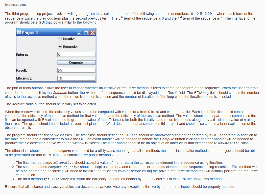 The pair of radio buttons allows the user to choose whether an iterative or recursive method is used to compute the term of the sequence. When the user enters a value for n and then clicks the Compute button, the nth term of the sequence should be displayed in the Result field. The Efficiency field should contain the number of calls to the recursive method when the recursive option is chosen and the number of iterations of the loop when the iterative option is selected.