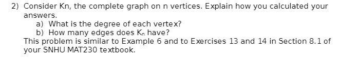 Consider Kn, the complete graph on n vertices. Explain how you calculated your answers. a) What is the degree of each vertex? b) How many edges does Kn have? This problem is similar to Example 6 and to Exercises 13 and 14 in Section 8.1 of your SNHU MAT230 textbook. This text was automatically generated from the attachment. Please refer to the attachment to view this question.Â