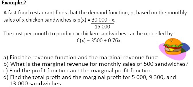 Example 2 A fast food restaurant finds that the demand function, p, based on the monthly sales of x chicken sandwiches is p(x) = 30 000 - x. 15 000 The cost per month to produce x chicken sandwiches can be modelled by C(x) = 3500 + 0.76x. . a) Find the revenue function and the marginal revenue func1 b) What is the marginal revenue for monthly sales of 500 sandwiches? c) Find the profit function and the marginal profit function. d) Find the total profit and the marginal profit for 5 000, 9 300, and 13 000 sandwiches.Â
