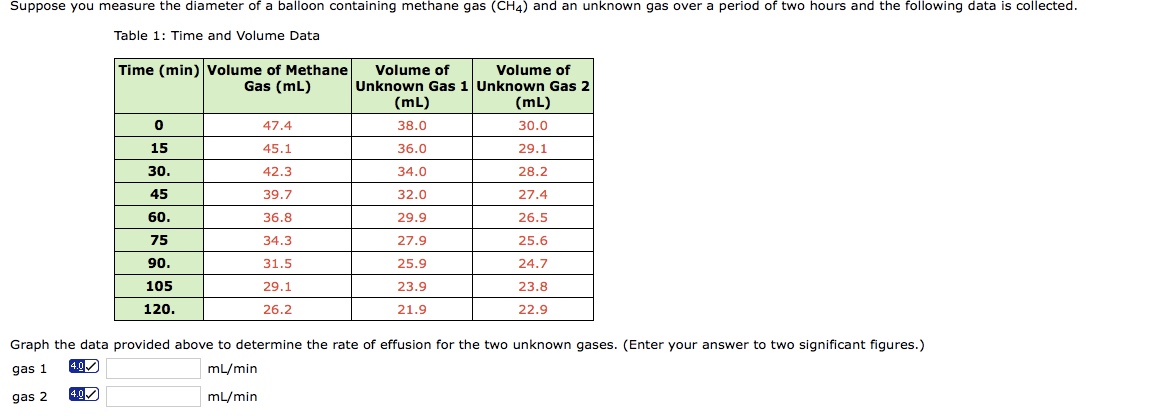Suppose you measure the diameter of a balloon containing methane gas (CH4) and an unknown gas over a period of two hours and the following data is collected. Table 1: Time and Volume Data Tlme (nlln) Volume of Methane Volume of Volume of