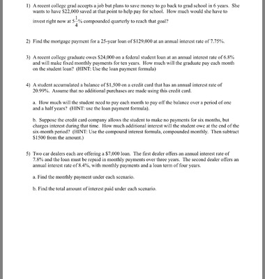 1. 1) A recent college grad accepts a job but plans to save money to go back to grad school in 6 years. She wants to have $22,000 saved at that point to help pay for school. How much would she have to 1 investrightnowat5 %compoundedquarterlytoreachthatgoal? 4
