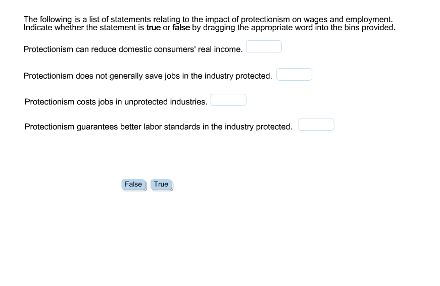 The following is a list of statements relating to the impact of protectionism on wages and employment. Indicate whether the statement is true or false by dragging the appropriate word into the bins provided.