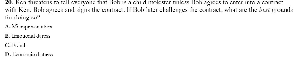 20. Ken threatens to tell everyone that Bob is a child molester unless Bob agrees to enter into a contract With Ken. Bob agrees and signs the contract. If Bob later challenges the contract, What are the best grounds for doing so? A. Misrepresentation B. Emotional duress C. Fraud D. Economic distressÂ