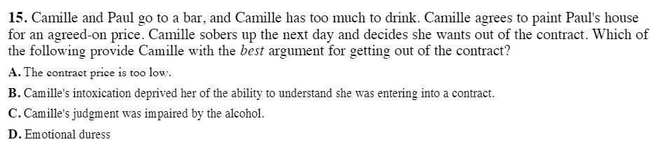 15. Camille and Paul go to a bar, and Camille has too much to drink. Camille agrees to paint Paul's house for an agreed—on price. Camille sobers up the next day and decides she wants out of the contract. Which of the following provide Camille with the best argument for getting out of the contract? A. The contract price is too low. B. Camille's intoxication deprived her of the ability to understand she was entering into a contract. C. Camille's judgment was impaired by the alcohol. D. Emotional duressÂ