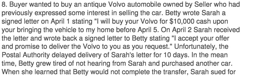8. Buyer wanted to buy an antique Volvo automobile owned by Seller who had previously expressed some interest in selling the car. Betty wrote Sarah a signed letter on April 1 stating "I will buy your Volvo for $10,000 cash upon your bringing the vehicle to my home before April 5. On April 2 Sarah received the letter and wrote back a signed letter to Betty stating "I accept your offer and promise to deliver the Volvo to you as you request." Unfortunately, the Postal Authority delayed delivery of Sarah's letter for 10 days. In the mean time, Betty grew tired of not hearing from Sarah and purchased another car. When she learned that Betty would not complete the transfer, Sarah sued forÂ