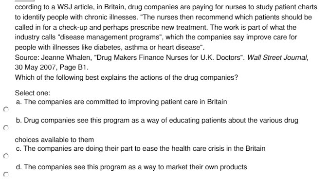 ccording to a WSJ article, in Britain, drug companies are paying for nurses to study patient charts to identify people with chronic illnesses. "The nurses then recommend which patients should be called in for a check-up and perhaps prescribe new treatment. The work is part of what the industry calls "disease management programs", which the companies say improve care for people with illnesses like diabetes, asthma or heart disease". Source: Jeanne Whalen, "Drug Makers Finance Nurses for UK. Doctors". Wall Street Journal, 30 May 2007, Page B1. Which of the following best explains the actions of the drug companies? Select one: a. The companies are committed to improving patient care in Britain b. Drug companies see this program as a way of educating patients about the various drug choices available to them c. The companies are doing their part to ease the health care crisis in the Britain d. The companies see this program as a way to market their own productsÂ