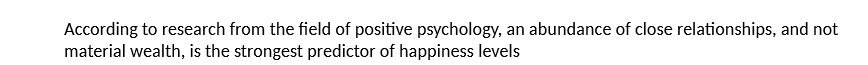 According to research from the field of positive psychology, an abundance of close relationships, and not material wealth, is the strongest predictor of happiness levels