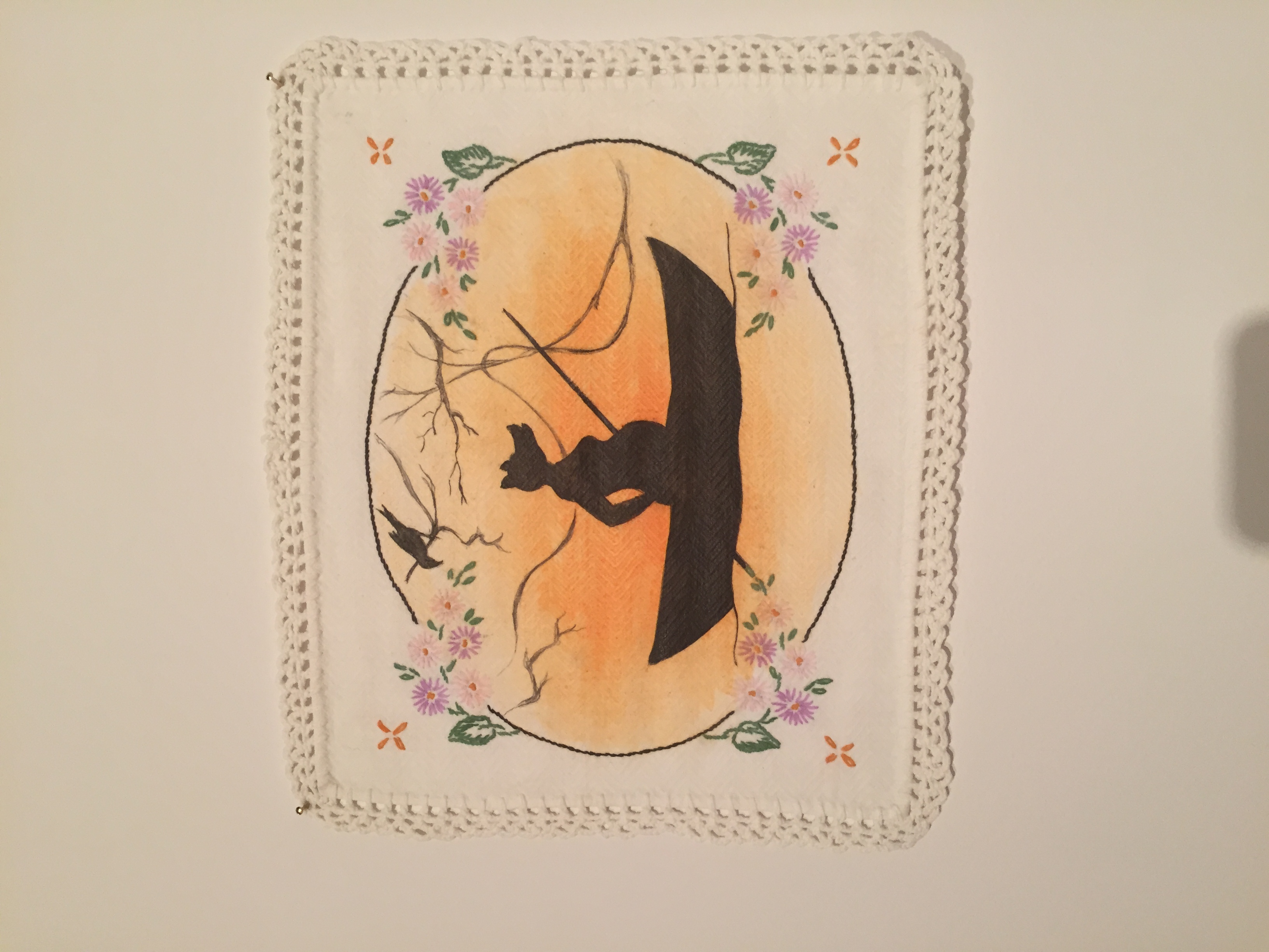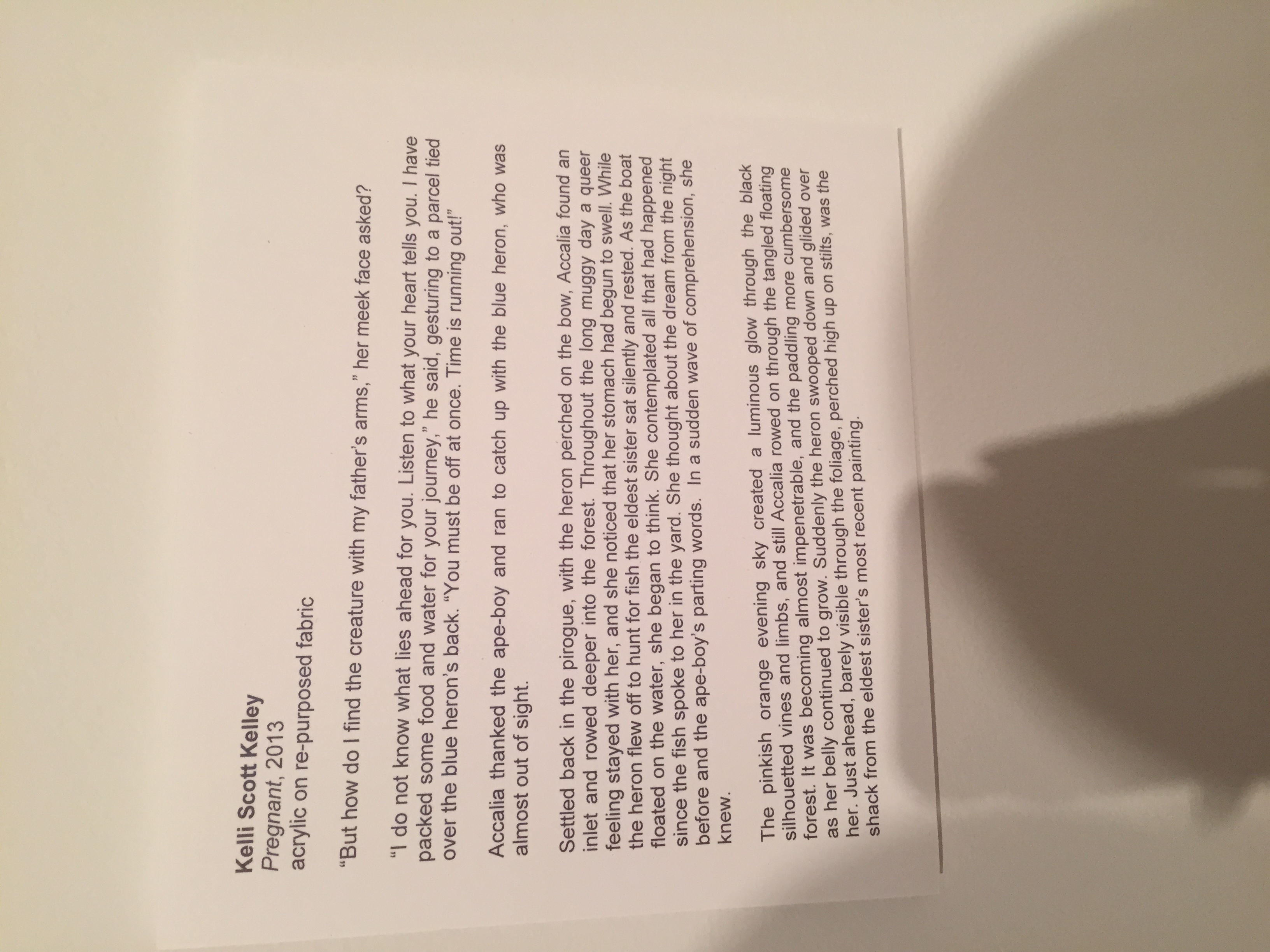 (        Actually, what comes in my mind when I see this artwork a pregnant woman. She is in her way to have a newborn baby. It shows also the period of time that she holds the baby inside of her body. However, Kelli Scott Keliey she is the one who created this gorgeous artwork. She used the acrylic on re-purposed fabric. The title of this artwork is Pregnant and she created it in 2013. Thus, first I noticed when I look at this work is the period of time of having baby because it show she is in the floating boat what it's mean she have period of time then she will arrive. Clearly, all the nine hard months will end with a new baby.)