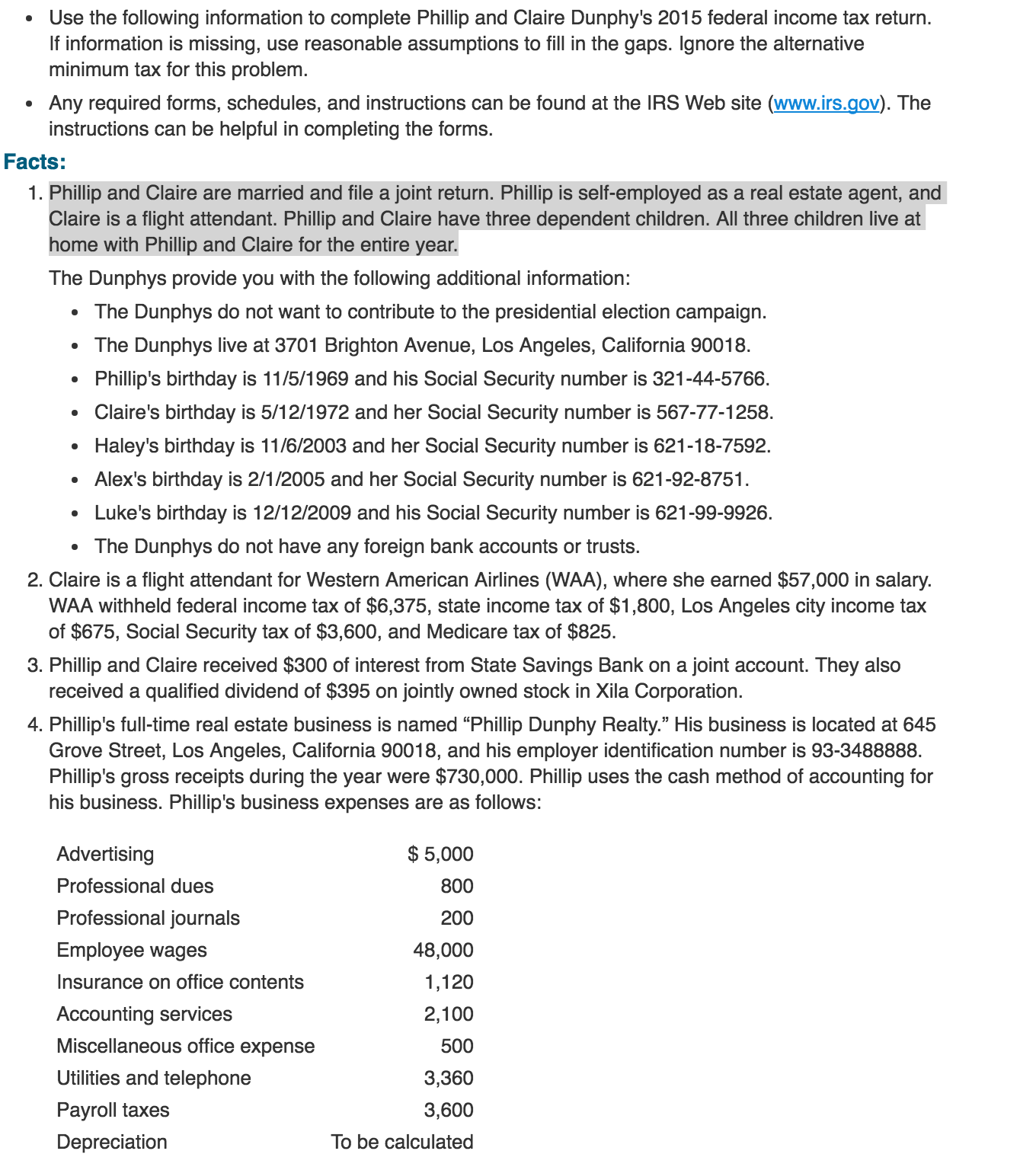 Also note that this problem from the textbook is a tax year 2015 return. The forms I have uploaded are 2016 forms. Just like with the previous tax return, pretend all of the information provided is for tax year 2016.