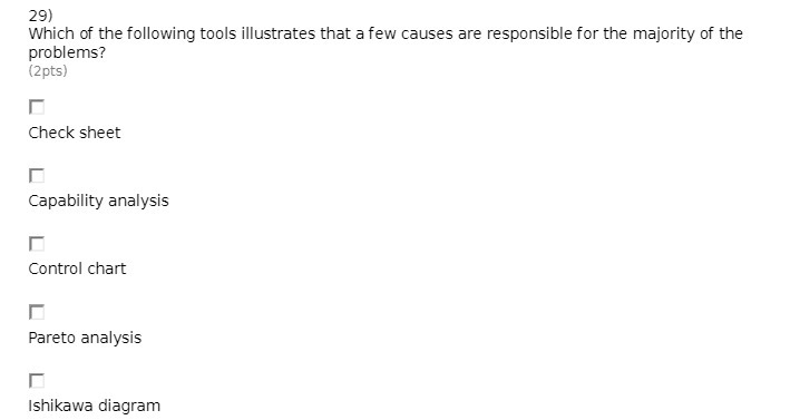 29) Which of the following tools illustrates that a few causes are responsible for the majority of the problems? (2 MS) I— Check sheet I— Capability analysis |_ Control chart |_ Pareto analysis F Ishikawa diagramÂ