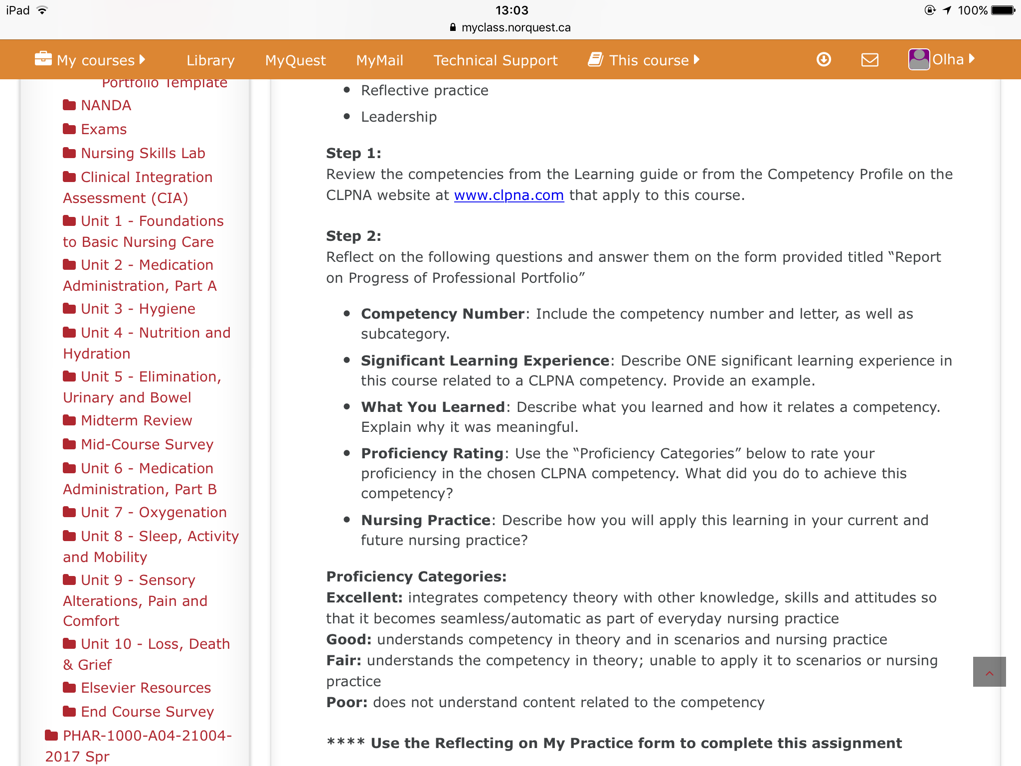 I Midterm Review Explain why it was meaningful. I Mid-Course Survey 0 Proficiency Rating: Use the “Proficiency Categories” below to rate your I Unit 6 ' Medication proficiency in the chosen CLPNA competency. What did you do to achieve this