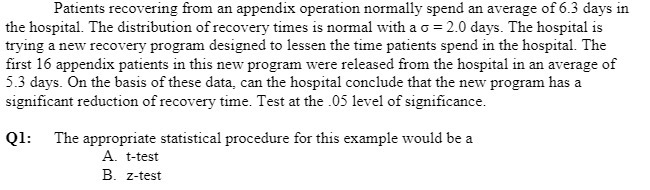 Patients recovering from an appendix operation normally spend an average of 6.3 days in the hospital. The distribution of recovery times is normal with a o = 2.0 days. The hospital is trying a new recovery program designed to lessen the time patients spend in the hospital. The first 16 appendix patients in this new program were released from the hospital in an average of 5.3 days. On the basis of these data, can the hospital conclude that the new program has a significant reduction of recovery time. Test at the .05 level of significance. Q1: The appropriate statistical procedure for this example would be a A. t-test B. z-test