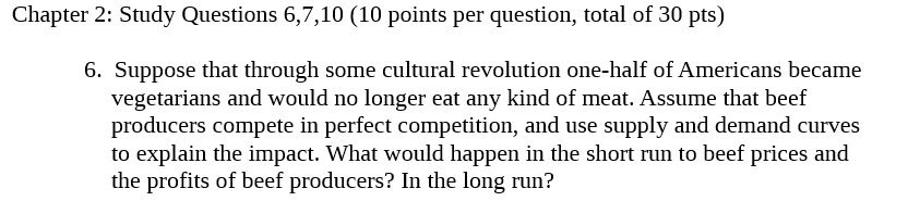 Chapter 2: Study Questions 6,7,10 (10 points per question, total of 30 pts) 6. Suppose that through some cultural revolution one-half of Americans became vegetarians and would no longer eat any kind of meat. Assume that beef producers compete in perfect competition, and use supply and demand curves to explain the impact. What would happen in the short run to beef prices and the profits of beef producers? In the long run?Â