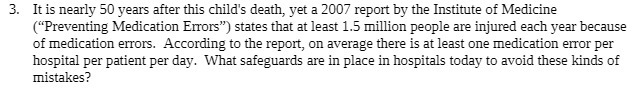 3. It is nearly 50 years after this child's death, yet a 2007 report by the Institute of Medicine (“Preventing Medication Errors”) states that at least 1.5 million people are injured each year because of medication errors. According to the report, on average there is at least one medication error per hospital per patient per day. What safeguards are in place in hospitals today to avoid these kinds of mistakes?