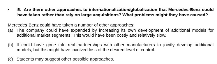 5. Are there other approaches to internationalizationIglobalization that Mercedes-Benz could have taken rather than rely on large acquisitions? What problems might they have caused? Mercedes-Benz could have taken a number of other approaches: (a) The company could have expanded by increasing its own development of additional models for additional market segments. This would have been costly and relatively slow. (b) It could have gone into real partnerships with other manufacturers to jointly develop additional models, but this might have involved loss of the desired level of control. (c) Students may suggest other possible approaches.Â