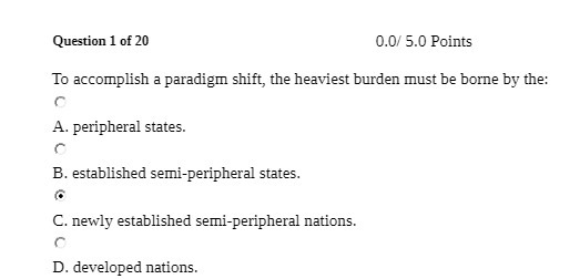Question 1 of 20 0.0/ 5.0 Points To accomplish a paradigm shift, the heaviest burden must be borne by the: t“ A. peripheral states. t“ B. established semi-peripheral states. r: C. newly established semi-peripheral nations. t‘“ D. developed nations.Â