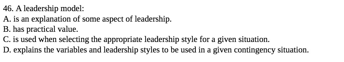 46. A leadership model: A. is an explanation of some aspect of leadership. B. has practical value. C. is used when selecting the appropriate leadership style for a given situation. D. explains the variables and leadership styles to be used in a given contingency situation.Â