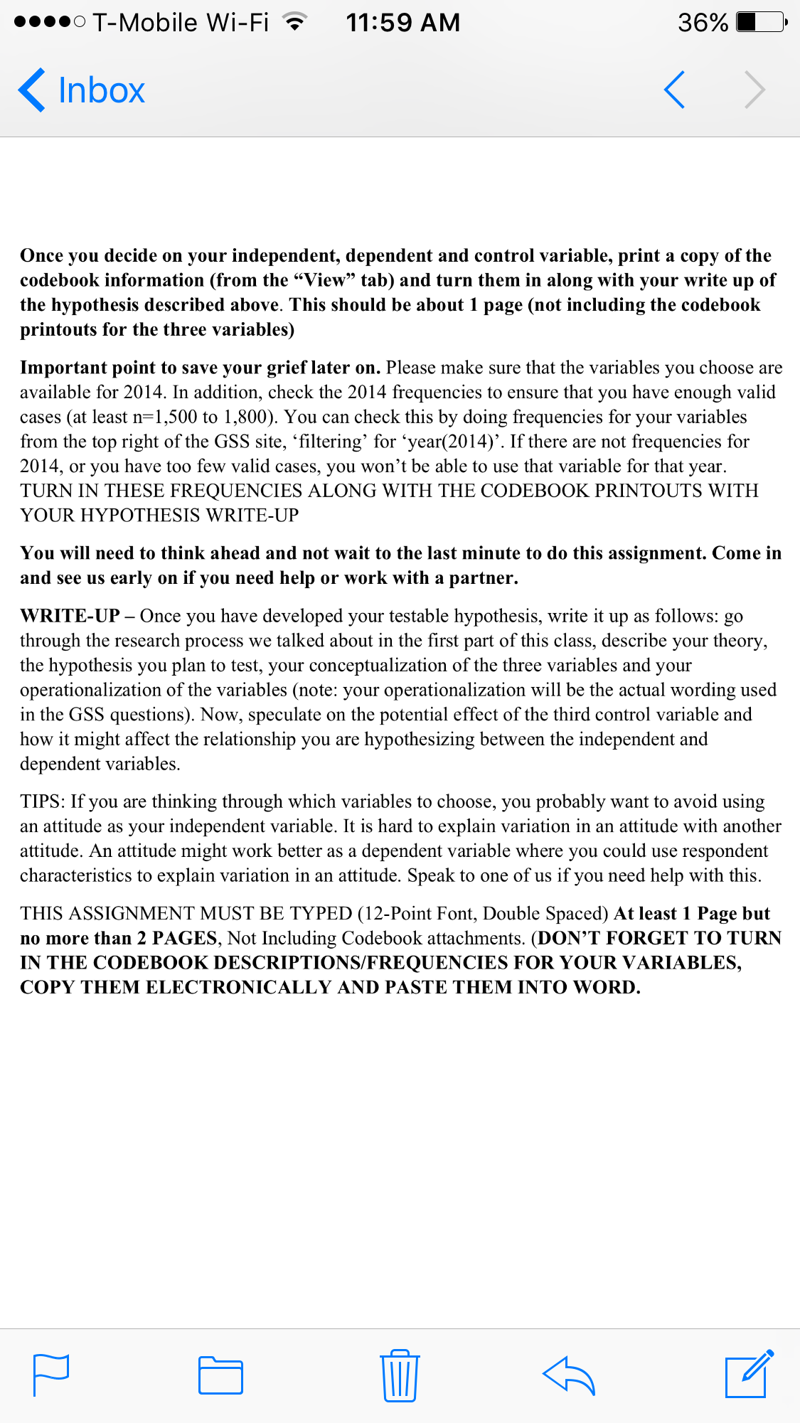 00000 T-Mobile Wi-Fi "5*" 11:59 AM 36% [1' < Inbox < SOC 311 SPRING 2017
