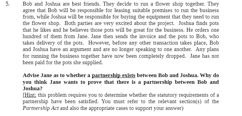 Bob and Joshua are best friends. They decide to run a flower shop together. They agree that Bob will be responsible for leasing suitable premises to run the business from, while Joshua will be responsible for buying the equipment that they need to run the flower shop. Both parties are very excited about the project. Joshua finds pots that he likes and he believes those pots will be great for the business. He orders one hundred of them from Jane. Jane then sends the invoice and the pots to Bob, who takes delivery of the pots. However, before any other transaction takes place, Bob and Joshua have an argument and are no longer speaking to one another. Any plans for running the business together have now been completely dropped. Jane has not been paid for the pots she supplied. Advise Jane as to whether a partnership exists between Bob and Joshua. Why do you think Jane wants to prove that there is a partnership between Bob and Joshua? [Hint: this problem requires you to determine whether the statutory requirements of a partnership have been satisfied. You must refer to the relevant section(s) of the Partnership Act and also the appropriate cases to support your answer)
