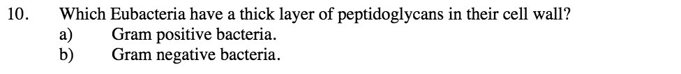 10. Which Eubacteria have a thick layer of peptidoglycans in their cell wall? a) Gram positive bacteria. b) Gram negative bacteria.Â