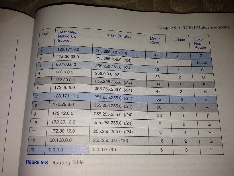 4. A router that has the routing table in Figure 9-8 receives an incoming packet. The source IP address is 10.55.72.234. The destination host is 10.4.6.7. The TTL value is 1. The Protocol field value is 6. What will the router do with this packet?