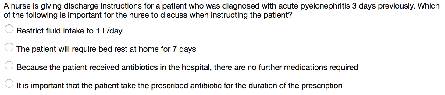 A nurse is giving discharge instructions for a patient who was diagnosed with acute pyelonephritis 3 days previously. Which of the following is important for the nurse to discuss when instructing the patient?