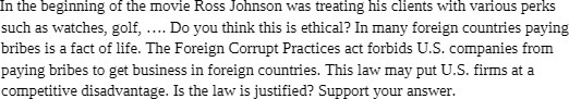 In the beginning of the movie Ross Johnson was treating his clients with various perks such as watches, golf, Do you think this is ethical? In many foreign countries paying bribes is a fact of life. The Foreign Corrupt Practices act forbids U.S. companies from paying bribes to get business in foreign countries. This law may put U.S. firms at a competitive disadvantage. Is the law is justified? Support your answer.Â