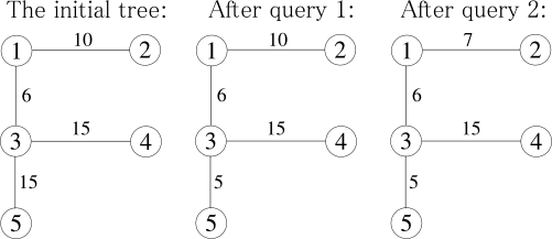 You are also given Q queries, where the ith query is described by two integer Ai and Ci. In the ith query, the number associated with the Aith edge will be changed Ci. You also want to calculate the answer for the tree after each query.