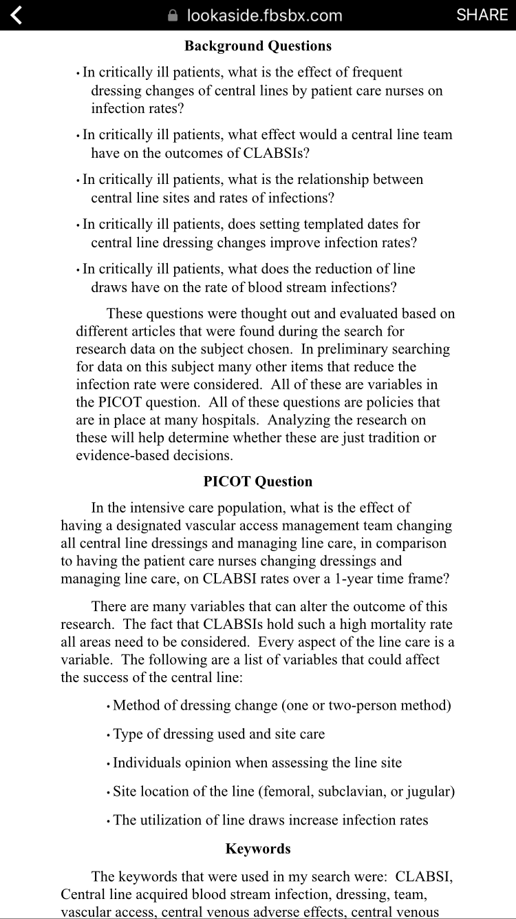 Need a 3-4 page paper A summary of your area of interest (catheters- associated urinary tract infection) an identification of the problem that you selected, and an explanation of the significance of this problem for nursing practice. --The 5 questions you have generated and a description of how you analyzed them for feasibility. Your preliminary PICOT question and a description of each PICOT variable relevant to your question. --At least 10 possible keywords that could be used when conducting literature search for PICOT question and a rationale for your selections.