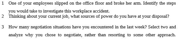 One of your employees slipped on the office floor and broke her arm. Identify the steps you would take to investigate this workplace accident. Thinking about your currentjob, what sources of power do you have at your disposal? How many negotiation situations have you encountered in the last week? Select two and analyze why you chose to negotiate, rather than resorting to some other approach.Â