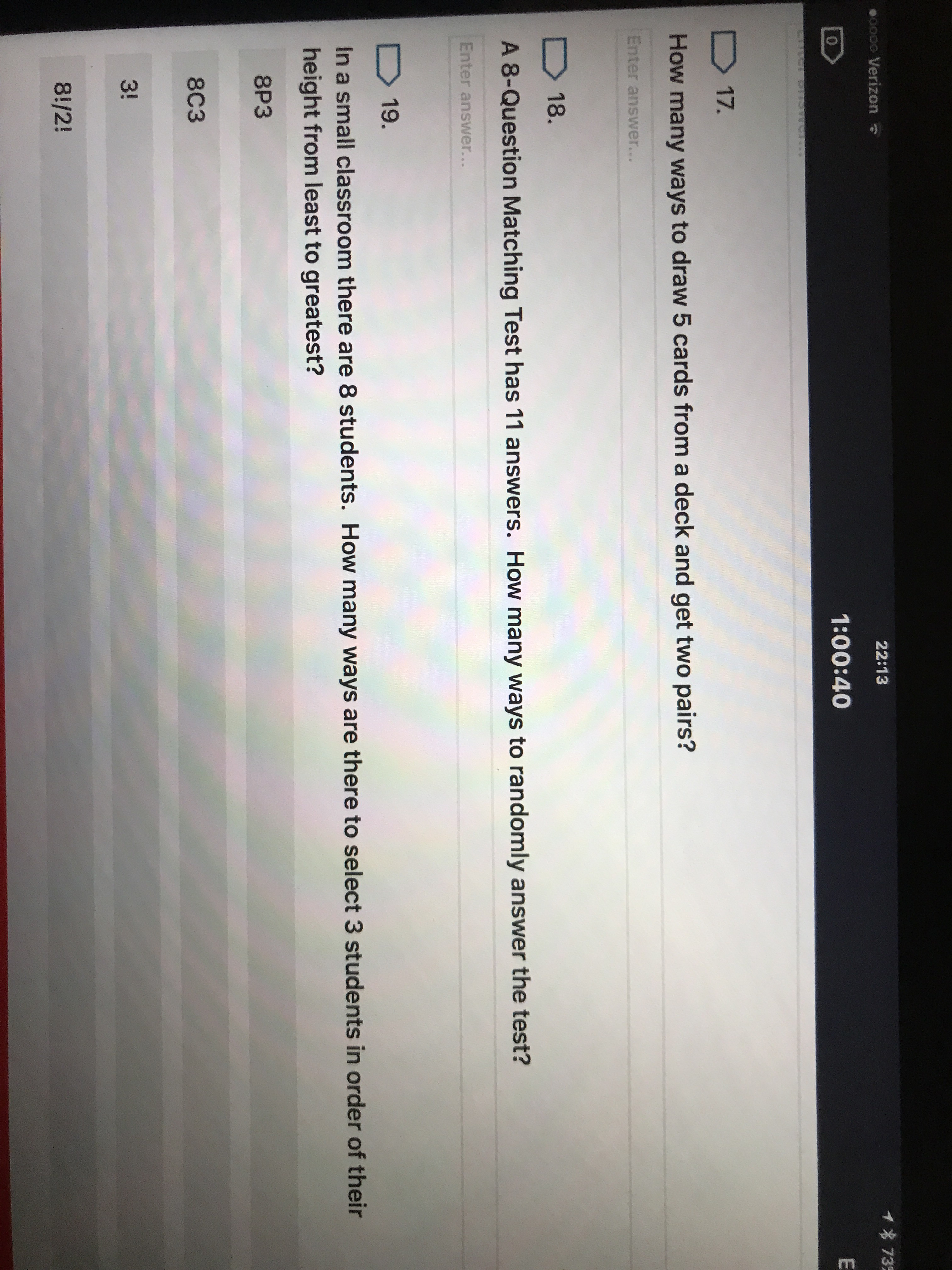 How many ways to draw 5 cards from a deck and get two pairs? 18) A 8-question matching test has 11 answers. how many ways to randomly answer the test 19) In a small classroom there are 8 students. How many ways are there to select 3 students in order of their height from least to greatest?