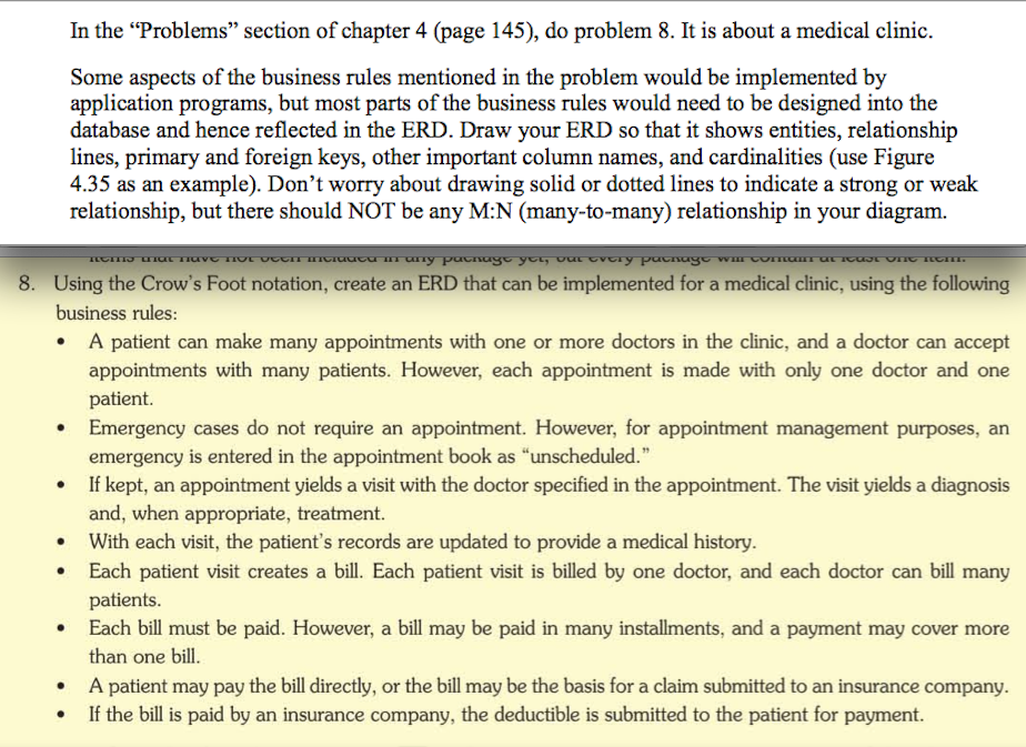 Using the crow foot notation draw the ER diagram of the attached business rules. Some aspects of the business rules mentioned in the problem would be implemented by application programs, but most of the business rules would need to be designed into database hence reflected in the ERD.Business rules:A patient can many appointments with one or more doctors in the clinic, the doctor can accept appointments with many patients. However, each appointment is made with only one doctor and one patient.