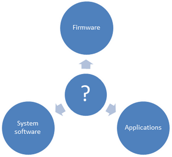 Alternative versionThe center circle contains a question mark. Three outer circles with arrows pointing from the center circle are labeled “Firmware,” “System Software,” and “Applications” respectively.