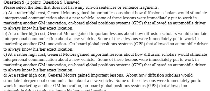 Question 9 (1 point) Question 9 Unsaved Please select the item that does not have any run-on sentences or sentence fragments. a) At a rather high cost, General Motors gained important lessons about how diffusion scholars would stimulate interpersonal communication about a new vehicle, some of these lessons were immediately put to work in marketing another GM innovation, on-board global positions systems (GPS) that allowed an automobile driver to always know his/her exact location. b) At a rather high cost, General Motors gained important lessons about how diffusion scholars would stimulate interpersonal communication about a new vehicle. Some of these lessons were immediately put to work in marketing another GM innovation. On-board global positions systems (GPS) that allowed an automobile driver to always know his/her exact location. c) At a rather high cost, General Motors gained important lessons about how diffusion scholars would stimulate interpersonal communication about a new vehicle. Some of these lessons were immediately put to work in marketing another GM innovation, on-board global positions systems (GPS) that allowed an automobile driver to always know his/her exact location. d) At a rather high cost, General Motors gained important lessons. About how diffusion scholars would stimulate interpersonal communication about a new vehicle. Some of these lessons were immediately put to work in marketing another GM innovation, on-board global positions systems (GPS) that allowed an :I11fnmnl-riln Hfixrnr fn :Ilnrzlwc lznnnr hie/11cm szlf‘lf lnr‘lzlf'i n11
