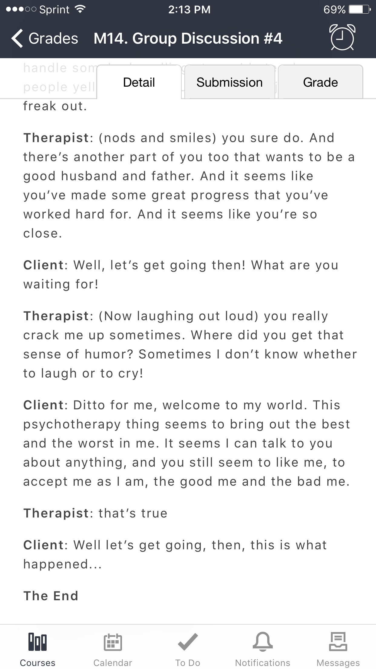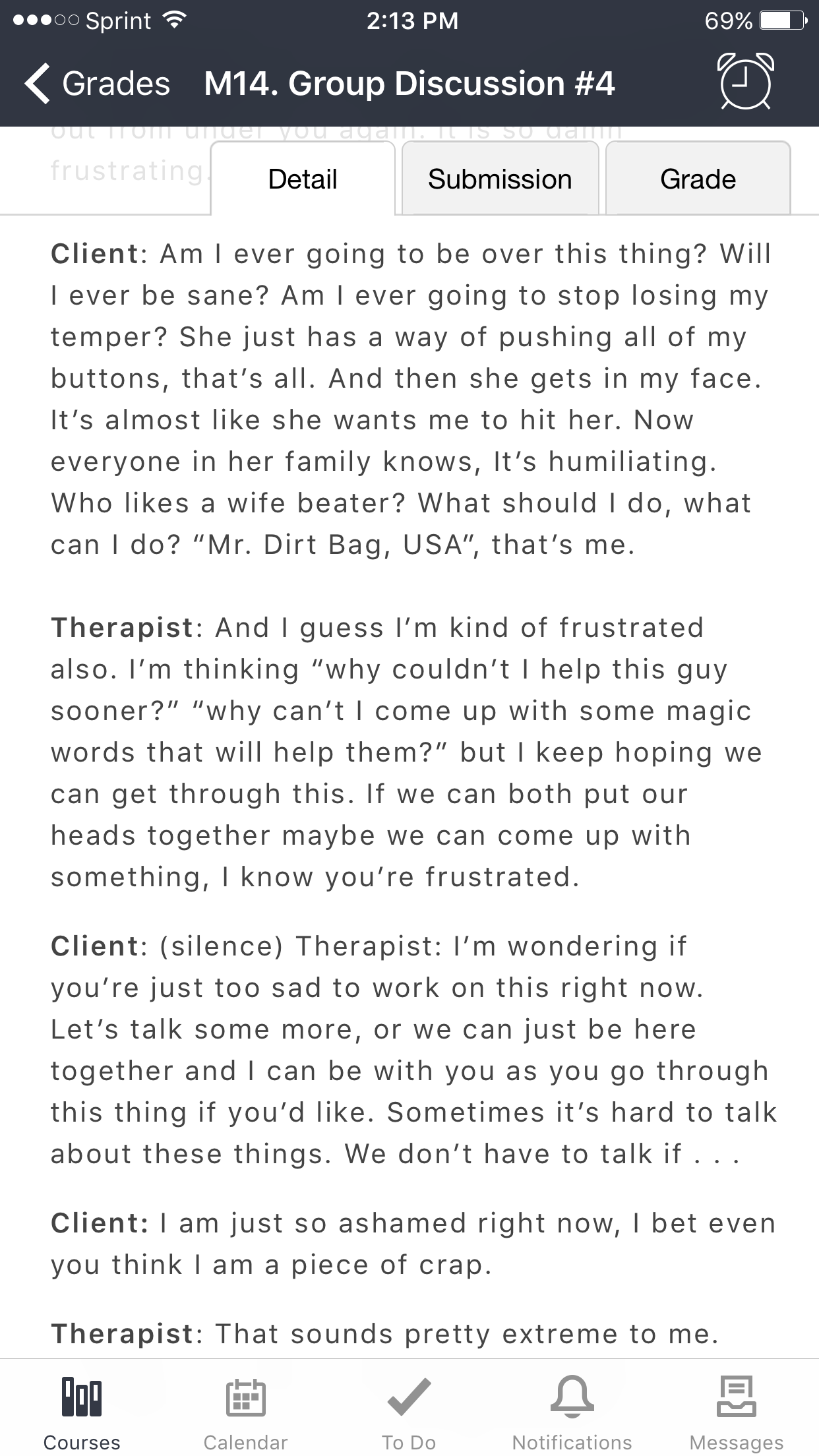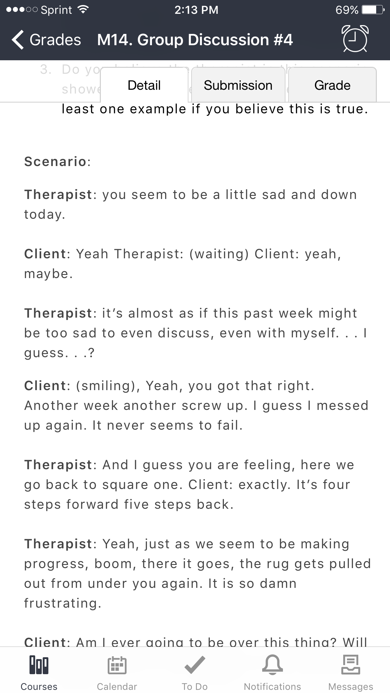 < Grades M14. Group Discussion #4 @ Detail Submission Grade least one example if you believe this is true. Scenaflo: Therapist: you seem to be a little sad and down