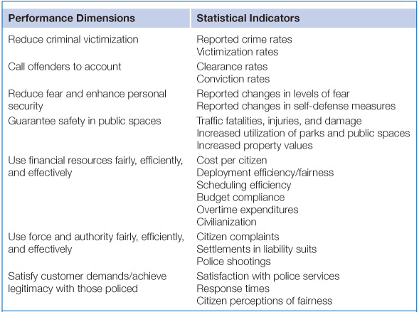 Consider the Statistical Measures of Police Organizational Performance presented in the textbook and discuss which dimension you consider most and least important in the evaluation of overall police performance.