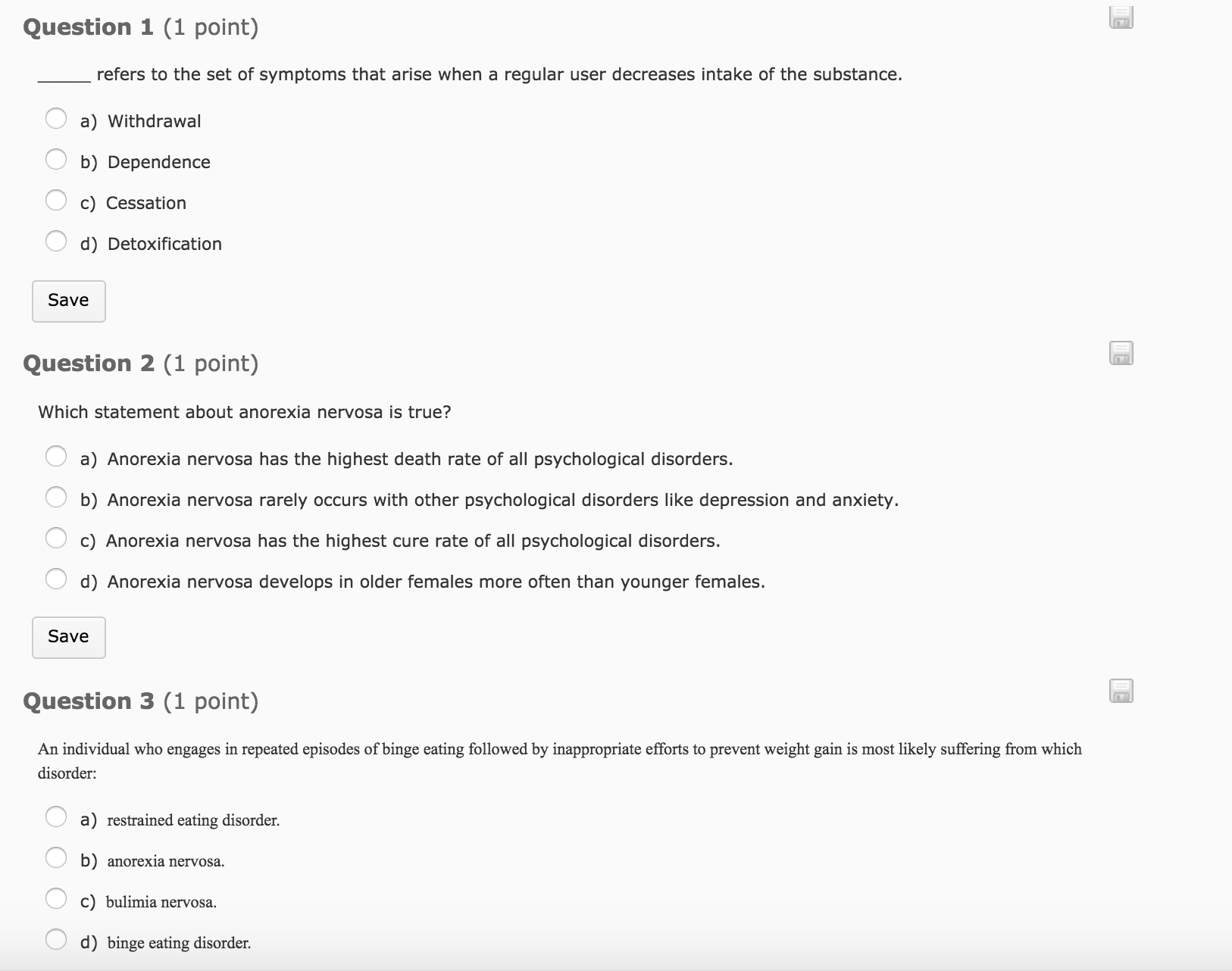 ‘ c) Anorexia nervosa has the highest cure rate of all psychological disorders. d) Anorexia nervosa develops in older females more often than younger females. Save Question 3 (1 point) An individual who engages in repeated episodes of binge eating followed by inappropriate efforts to prevent weight gain is most likely suffering fiom which