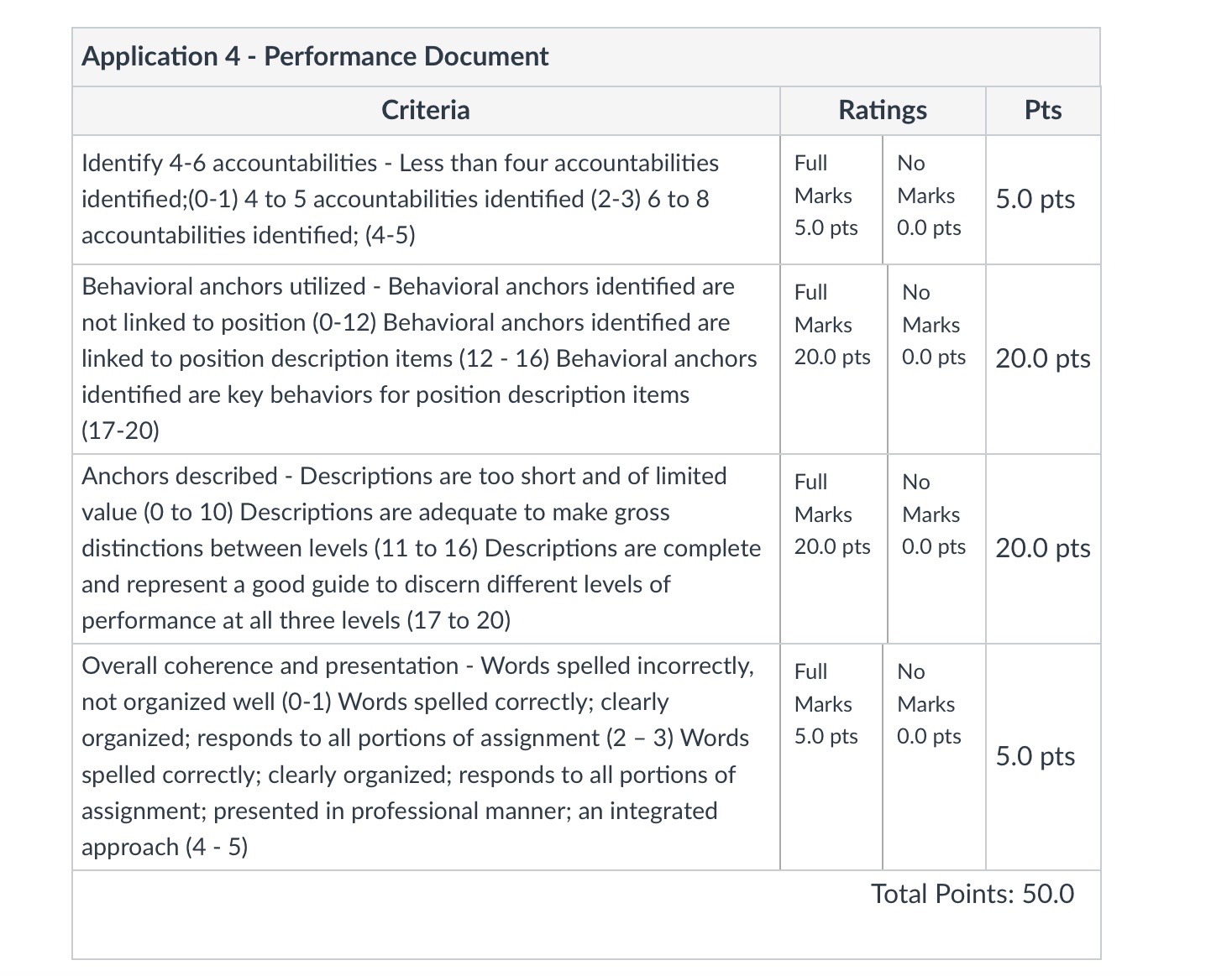 You are to use thejob description you wrote and develop a behaviorally anchored rating scale (BARS) to use as a performance appraisal document. So, you are to take the primary responsibilities and develop at least three levels of behaviorally anchored ratings for at least 4-8 accountabilities. In the example posted, there are three levels of performance identified—marginal, acceptable and outstanding. You may develop four or five levels if you like. This will be taken into account in the grading. In other words, if you were to develop five levels of performance and describe these for four accountabilities—this would be viewed as similar in effort to defining three levels for six accountabilities. I have attached a word document under this lesson tab that gives you some idea as to how I will grade the assignment; this also serves as a model for what you might present--as one possibility. If you have a better idea, that is fine, but it must have at least three levels of performance and be a behaviorally anchored system.