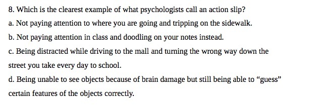 8. Which is the clearest example of what psychologists call an action slip? a. Not paying attention to where you are going and tripping on the sidewalk. b. Not paying attention in class and doodling on your notes instead. c. Being distracted while driving to the mall and turning the wrong way down the street you take every day to school. d. Being unable to see objects because of brain damage but still being able to “guess” certain features of the objects correctly.