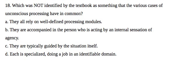 18. Which was NOT identified by the textbook as something that the various cases of unconscious processing have in common? a. They all rely on well-defined processing modules. b. They are accompanied in the person who is acting by an internal sensation of agency. c. They are typically guided by the situation itself. d. Each is specialized, doing a job in an identifiable domain.