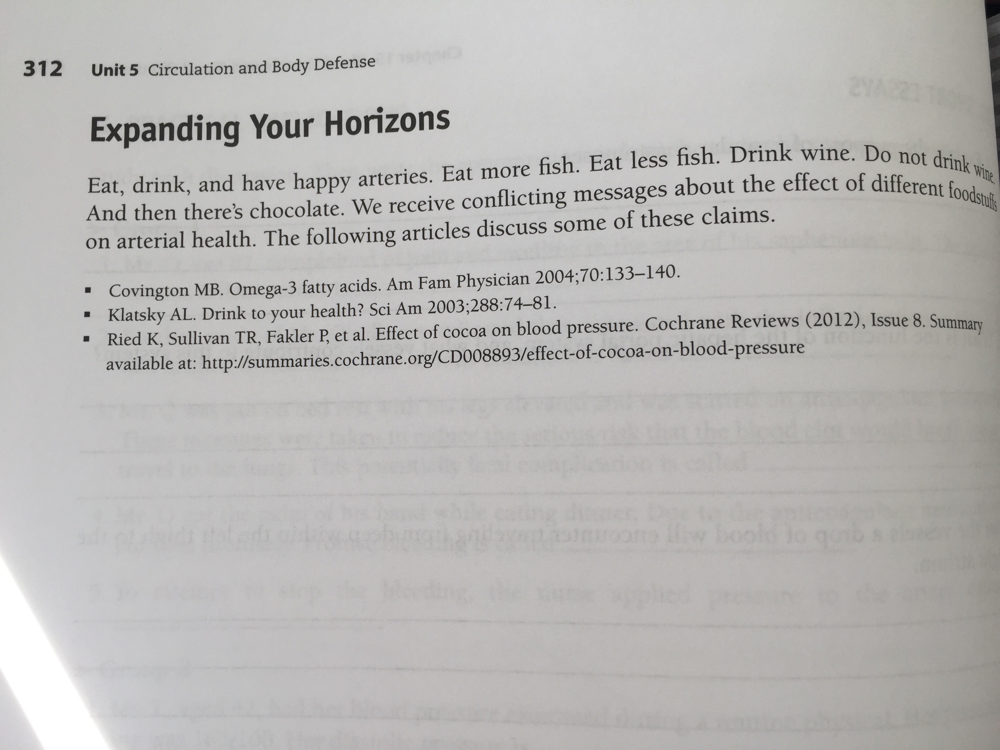 eat, drink, and have happy arteries. Eat more fish. Eat less fish. drink wine. do not drink wine. And then theres chocolate. We receive conflicting message about the effect of different foodstuffs on arterial heart. the following articles discuss some of these claims:Â