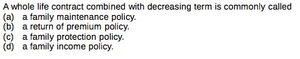 Awhole life contract combined with decreasing term is commonly called (a) a family maintenance policy. (b) a return of premium policy. (c) a family protection policy. (d) a family income policy.Â