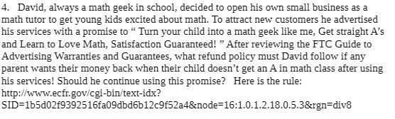 4. David, always a math geek in school, decided to open his own small business as a math tutor to get young kids excited about math. To attract new customers he advertised his services with a promise to “ Turn your child into a math geek like me, Get straight A’s and Learn to Love Math, Satisfaction Guaranteed! ” After reviewing the FTC Guide to Advertising Warranties and Guarantees, what refund policy must David follow if any parent wants their money back when their child doesn’t get an A in math class after using his services! Should he continue using this promise? Here is the rule: http://www.ecfr.gov/cgi-bin/text—idx? SID:1b5d02f9392516fa09dbd6b12c9f52a4&node=16:1.0.1.2.18.0.5.3&rgn=div8