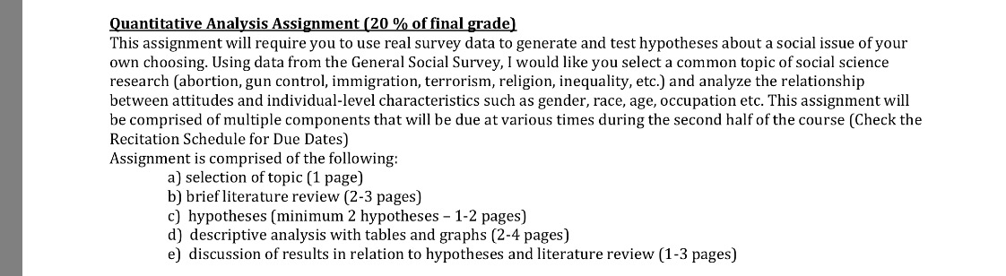 This is for my Intro to Social Research class. I am looking for a fully done assignment so I can get an idea of what to do on my own. This entire paper is due May 5th so I want to get an example paper for myself before the due date to really get a clear understanding of what I need to do. I expect this paper to be done professionally, not half-assed, since I'm going to be paying good money for it. Again, this is an example paper but it should be complete and professional as if it were an actual paper. I will not accept unfinished answers or research, so whoever accept this paper will do it to a high standard. Please read the instructions CAREFULLY and include each of the following sections. If you have any questions don't hesitate to ask me to get more information. Thanks in advance.