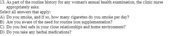 13. As part of the routine history for any woman's annual health examination, the clinic nurse appropriately asks: Select all answers that apply: A) Do you smoke, and if so, how many cigarettes do you smoke per day? B) Are you aware of the need for routine iron supplementation? C) Do you feel safe in your close relationships and home environment? D) Do you take any herbal medications?Â