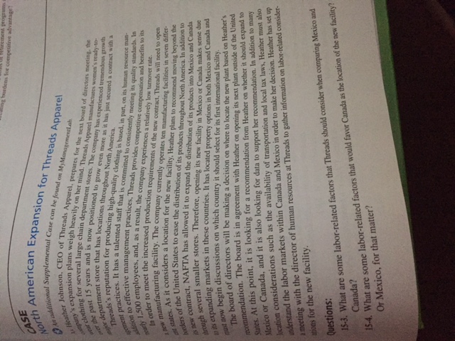 Read the North American Expansion for Threads Apparel case study on page 352 in the Martocchio text, and then prepare a 2-3 page paper that presents your analysis of the case by answering both questions. APA is not required for this paper.