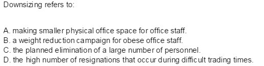 Downsizing refers to: A. making smaller physical office space for office staff. B. a weight reduction campaign for obese office staff. C. the planned elimination of a large number of personnel. D. the high number of resignations that occur during difficult trading times.Â