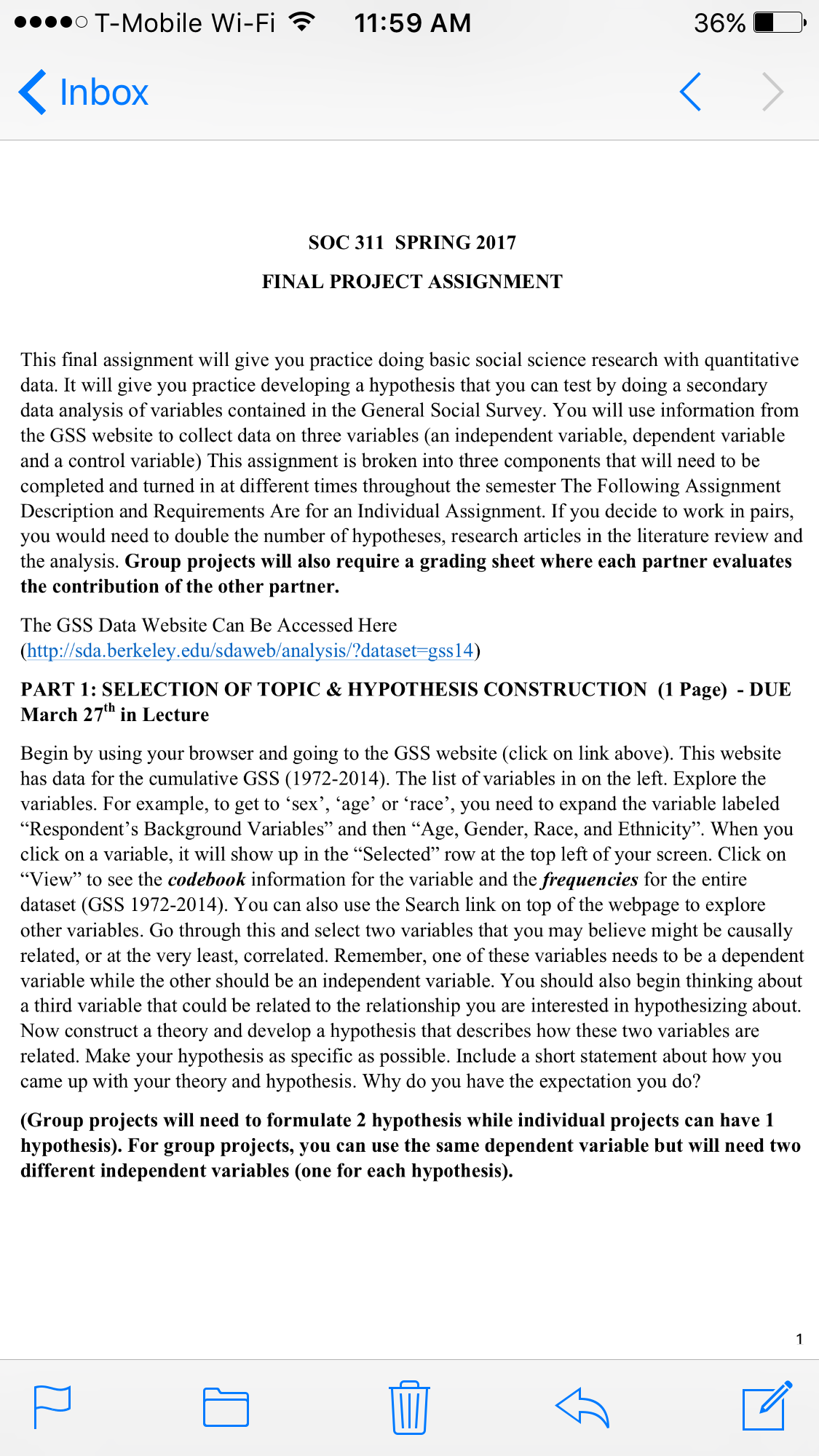 00000 T-Mobile Wi-Fi "5*" 11:59 AM 36% [1' < Inbox < SOC 311 SPRING 2017